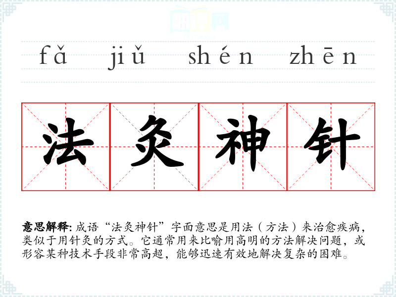 成语“法灸神针”字面意思是用法(方法)来治愈疾病,类似于用针灸的方式。它通常用来比喻用高明的方法解决问题,或形容某种技术手段非常高超,能够迅速有效地解决复杂的困难。