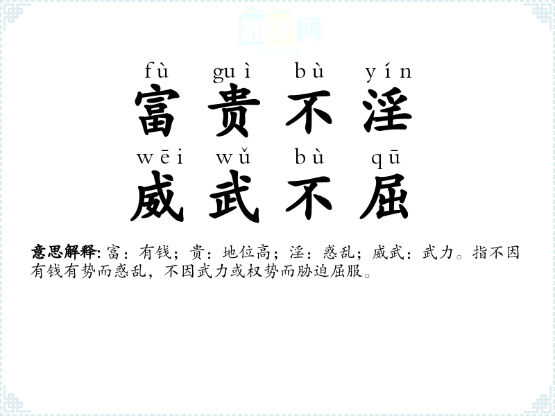 富:有钱;贵:地位高;淫:惑乱;威武:武力。指不因有钱有势而惑乱,不因武力或权势而胁迫屈服。
