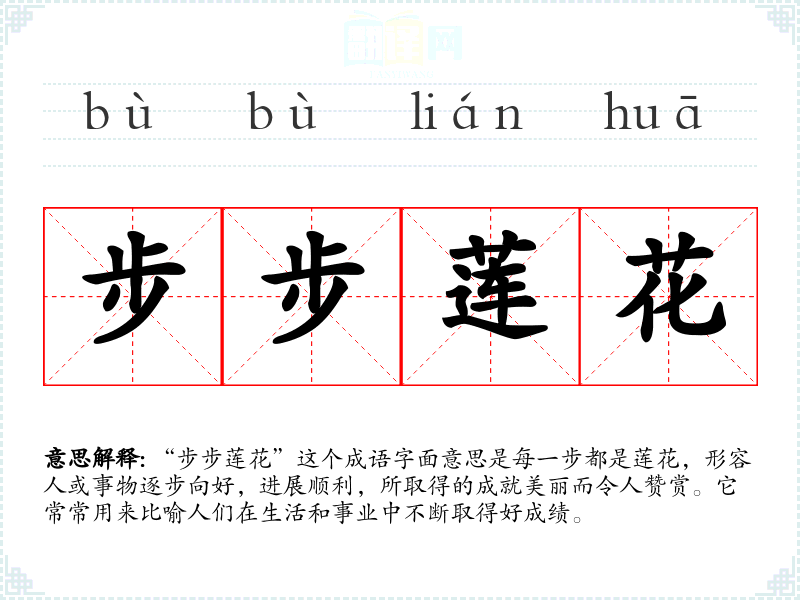 “步步莲花”这个成语字面意思是每一步都是莲花,形容人或事物逐步向好,进展顺利,所取得的成就美丽而令人赞赏。它常常用来比喻人们在生活和事业中不断取得好成绩。