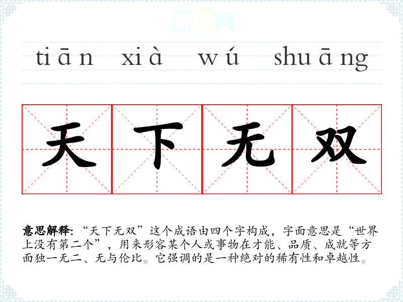 “天下无双”这个成语由四个字构成,字面意思是“世界上没有第二个”,用来形容某个人或事物在才能、品质、成就等方面独一无二、无与伦比。它强调的是一种绝对的稀有性和卓越性。