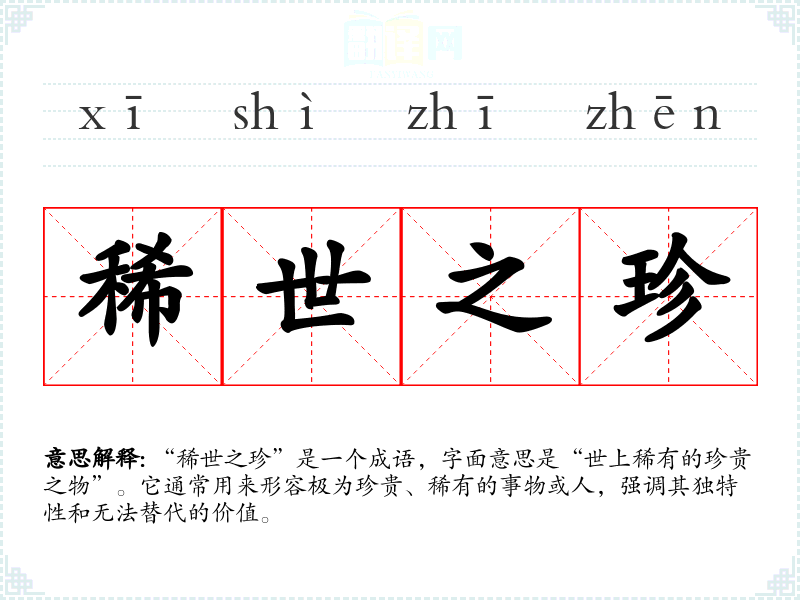 “稀世之珍”是一个成语,字面意思是“世上稀有的珍贵之物”。它通常用来形容极为珍贵、稀有的事物或人,强调其独特性和无法替代的价值。