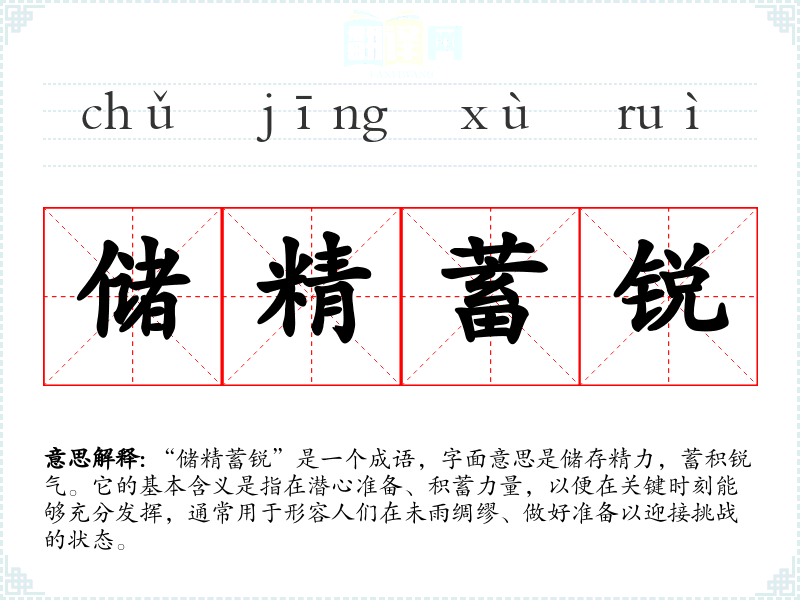 “储精蓄锐”是一个成语,字面意思是储存精力,蓄积锐气。它的基本含义是指在潜心准备、积蓄力量,以便在关键时刻能够充分发挥,通常用于形容人们在未雨绸缪、做好准备以迎接挑战的状态。