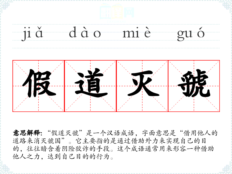 “假道灭虢”是一个汉语成语,字面意思是“借用他人的道路来消灭虢国”。它主要指的是通过借助外力来实现自己的目的,往往暗含着阴险狡诈的手段。这个成语通常用来形容一种借助他人之力,达到自己目的的行为。