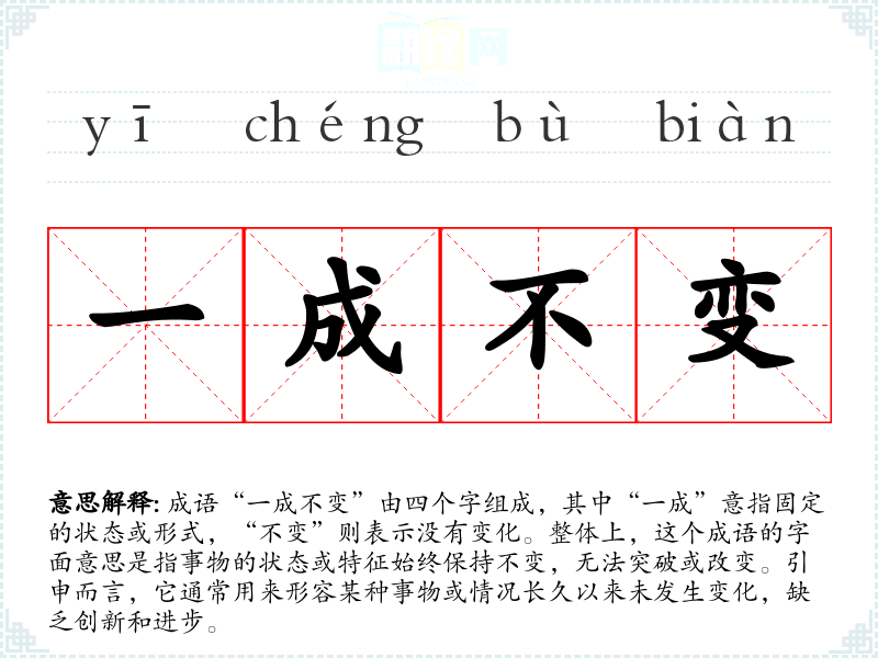 成语“一成不变”由四个字组成,其中“一成”意指固定的状态或形式,“不变”则表示没有变化。整体上,这个成语的字面意思是指事物的状态或特征始终保持不变,无法突破或改变。引申而言,它通常用来形容某种事物或情况长久以来未发生变化,缺乏创新和进步。