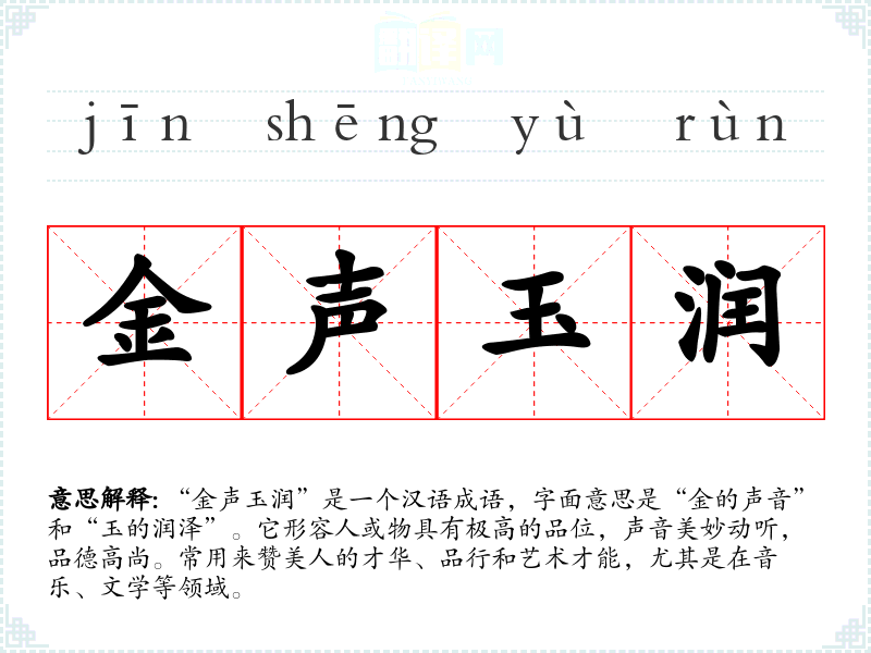 “金声玉润”是一个汉语成语,字面意思是“金的声音”和“玉的润泽”。它形容人或物具有极高的品位,声音美妙动听,品德高尚。常用来赞美人的才华、品行和艺术才能,尤其是在音乐、文学等领域。