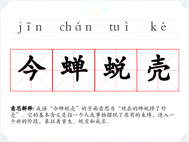 成语“今蝉蜕壳”的字面意思为“现在的蝉蜕掉了外壳”。它的基本含义是指一个人或事物摆脱了原有的束缚,进入一个新的阶段,象征着重生、蜕变和成长。