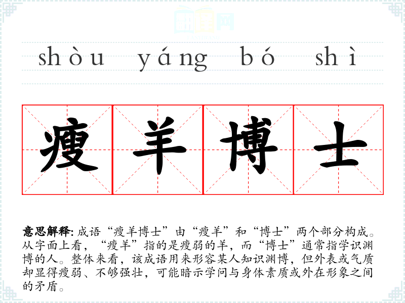 “瘦羊博士”并不是一个传统的成语,可能是现代汉语中的一种新兴用法。它的形成可能源于对“博学”和“瘦弱”之间对比的关注,反映了现代社会对知识分子的某种刻板印象。具体的历史背景或文学出处尚无明确记载。
