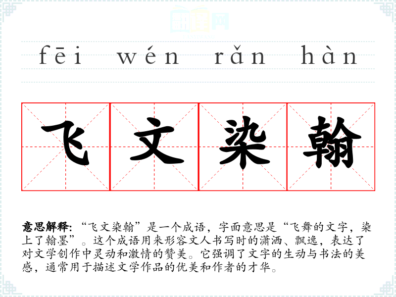- 日常对话:在朋友分享自己的写作时,可以用“你的文字真是飞文染翰,读起来让人心旷神怡”来鼓励对方。