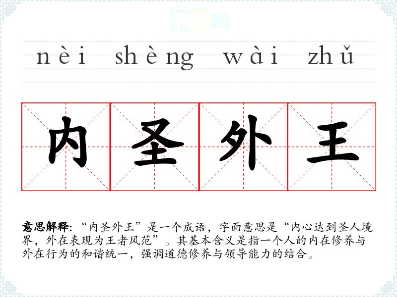 “内圣外王”是一个成语,字面意思是“内心达到圣人境界,外在表现为王者风范”。其基本含义是指一个人的内在修养与外在行为的和谐统一,强调道德修养与领导能力的结合。