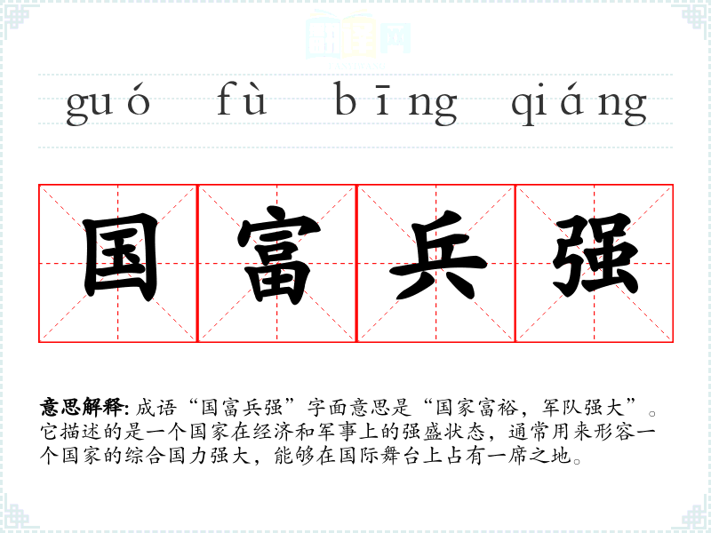 成语“国富兵强”字面意思是“国家富裕,军队强大”。它描述的是一个国家在经济和军事上的强盛状态,通常用来形容一个国家的综合国力强大,能够在国际舞台上占有一席之地。