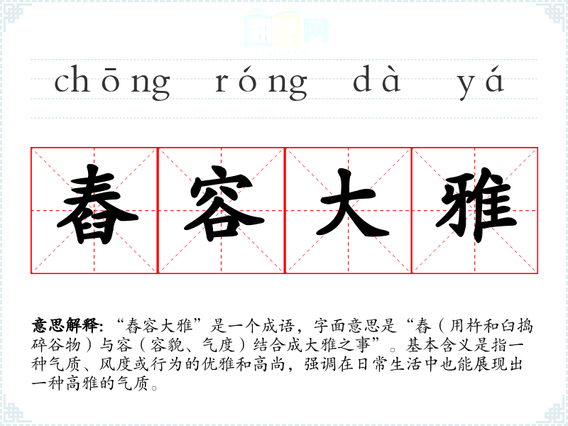 “舂容大雅”是一个成语,字面意思是“舂(用杵和臼捣碎谷物)与容(容貌、气度)结合成大雅之事”。基本含义是指一种气质、风度或行为的优雅和高尚,强调在日常生活中也能展现出一种高雅的气质。