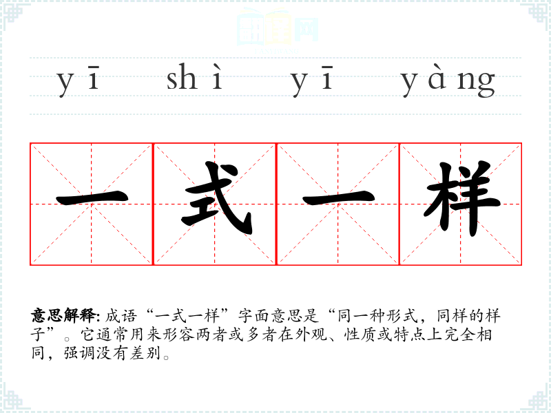 成语“一式一样”字面意思是“同一种形式,同样的样子”。它通常用来形容两者或多者在外观、性质或特点上完全相同,强调没有差别。