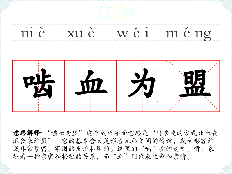 “啮血为盟”这个成语字面意思是“用啮咬的方式让血液混合来结盟”。它的基本含义是形容兄弟之间的情谊,或者形容结成非常紧密、牢固的友谊和盟约。这里的“啮”指的是咬、啃,象征着一种亲密和牺牲的关系,而“血”则代表生命和亲情。