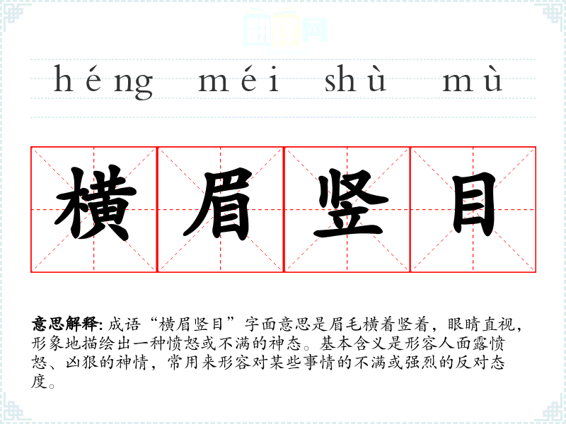 成语“横眉竖目”字面意思是眉毛横着竖着,眼睛直视,形象地描绘出一种愤怒或不满的神态。基本含义是形容人面露愤怒、凶狠的神情,常用来形容对某些事情的不满或强烈的反对态度。