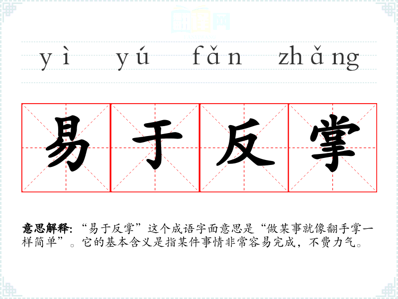 “易于反掌”这个成语字面意思是“做某事就像翻手掌一样简单”。它的基本含义是指某件事情非常容易完成,不费力气。