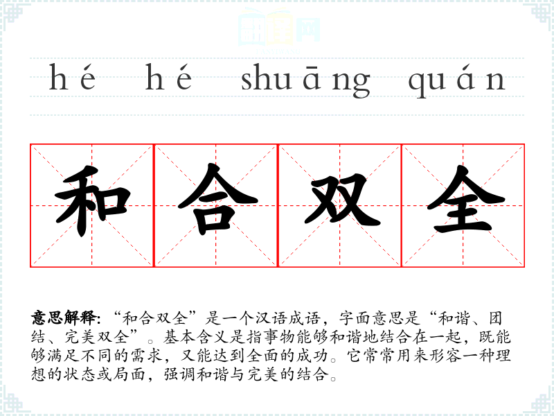 “和合双全”是一个汉语成语,字面意思是“和谐、团结、完美双全”。基本含义是指事物能够和谐地结合在一起,既能够满足不同的需求,又能达到全面的成功。它常常用来形容一种理想的状态或局面,强调和谐与完美的结合。