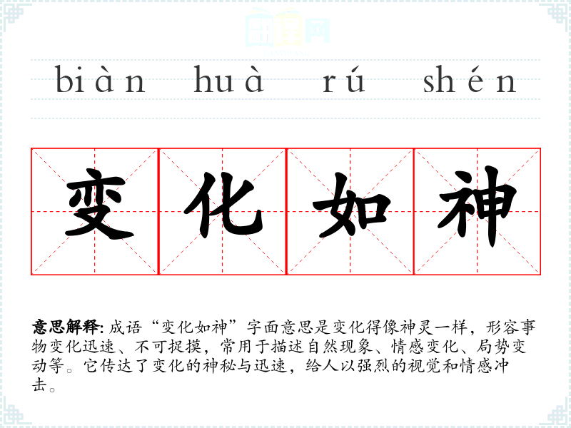 成语“变化如神”字面意思是变化得像神灵一样,形容事物变化迅速、不可捉摸,常用于描述自然现象、情感变化、局势变动等。它传达了变化的神秘与迅速,给人以强烈的视觉和情感冲击。