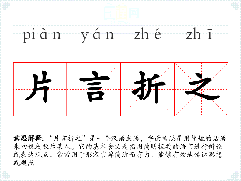 “片言折之”是一个汉语成语,字面意思是用简短的话语来劝说或驳斥某人。它的基本含义是指用简明扼要的语言进行辩论或表达观点,常常用于形容言辞简洁而有力,能够有效地传达思想或观点。