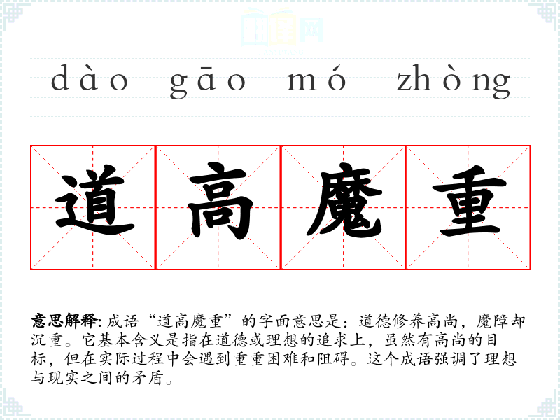 成语“道高魔重”的字面意思是:道德修养高尚,魔障却沉重。它基本含义是指在道德或理想的追求上,虽然有高尚的目标,但在实际过程中会遇到重重困难和阻碍。这个成语强调了理想与现实之间的矛盾。
