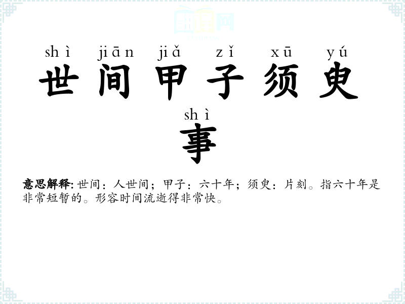 世间:人世间;甲子:六十年;须臾:片刻。指六十年是非常短暂的。形容时间流逝得非常快。