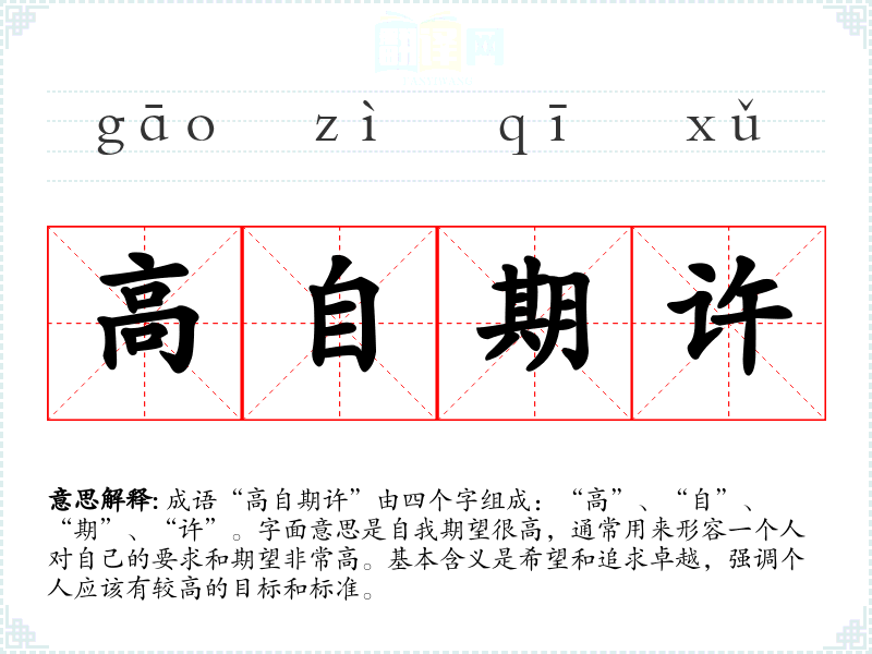 成语“高自期许”由四个字组成:“高”、“自”、“期”、“许”。字面意思是自我期望很高,通常用来形容一个人对自己的要求和期望非常高。基本含义是希望和追求卓越,强调个人应该有较高的目标和标准。