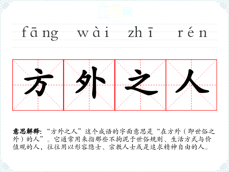 “方外之人”这个成语的字面意思是“在方外(即世俗之外)的人”。它通常用来指那些不拘泥于世俗规则、生活方式与价值观的人,往往用以形容隐士、**人士或是追求精神自由的人。