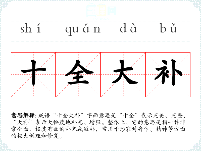 成语“十全大补”字面意思是“十全”表示完美、完整,“大补”表示大幅度地补充、增强。整体上,它的意思是指一种非常全面、极其有效的补充或滋补,常用于形容对身体、精神等方面的极大调理和修复。