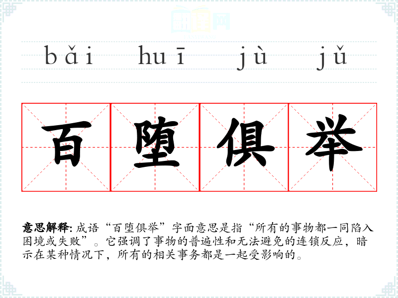 成语“百堕俱举”字面意思是指“所有的事物都一同陷入困境或失败”。它强调了事物的普遍性和无法避免的连锁反应,暗示在某种情况下,所有的相关事务都是一起受影响的。