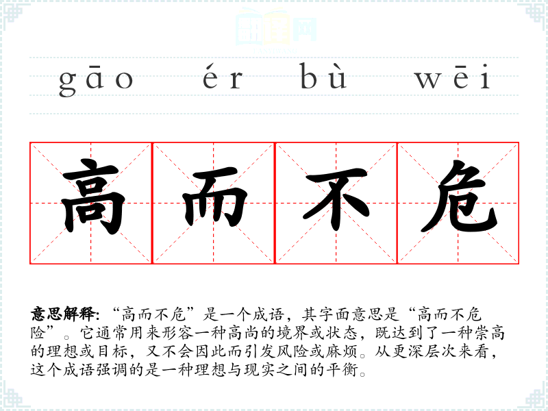 “高而不危”是一个成语,其字面意思是“高而不危险”。它通常用来形容一种高尚的境界或状态,既达到了一种崇高的理想或目标,又不会因此而引发风险或麻烦。从更深层次来看,这个成语强调的是一种理想与现实之间的平衡。