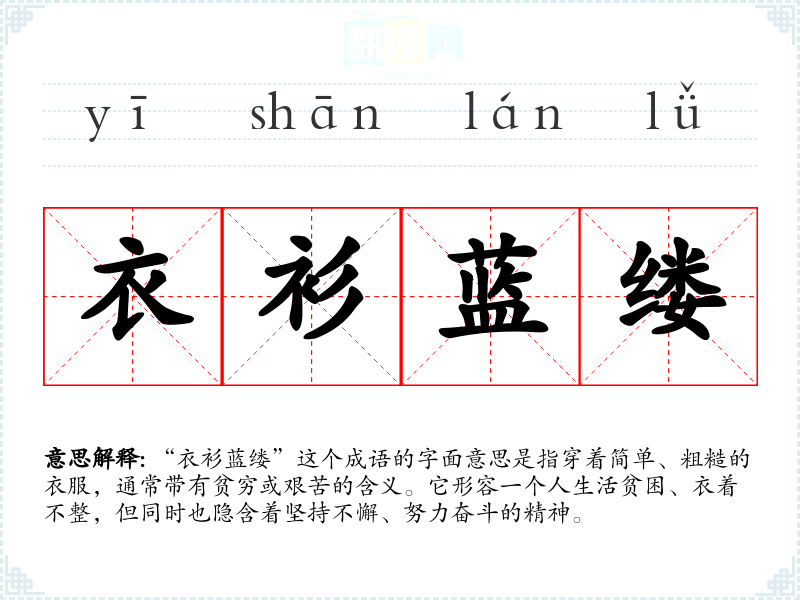 “衣衫蓝缕”这个成语的字面意思是指穿着简单、粗糙的衣服,通常带有贫穷或艰苦的含义。它形容一个人生活贫困、衣着不整,但同时也隐含着坚持不懈、努力奋斗的精神。