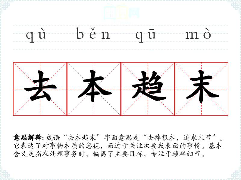 成语“去本趋末”字面意思是“去掉根本,追求末节”。它表达了对事物本质的忽视,而过于关注次要或表面的事情。基本含义是指在处理事务时,偏离了主要目标,专注于琐碎细节。