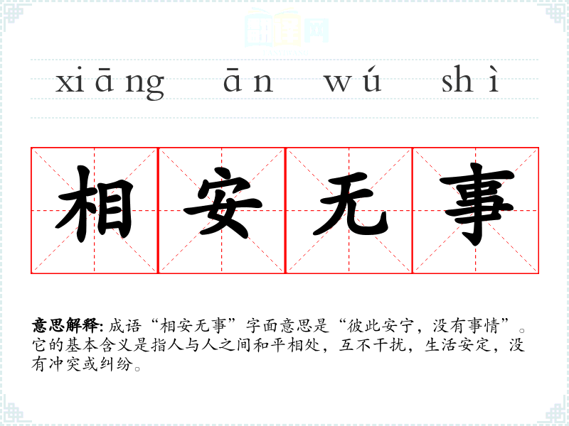 成语“相安无事”字面意思是“彼此安宁,没有事情”。它的基本含义是指人与人之间和平相处,互不干扰,生活安定,没有冲突或纠纷。