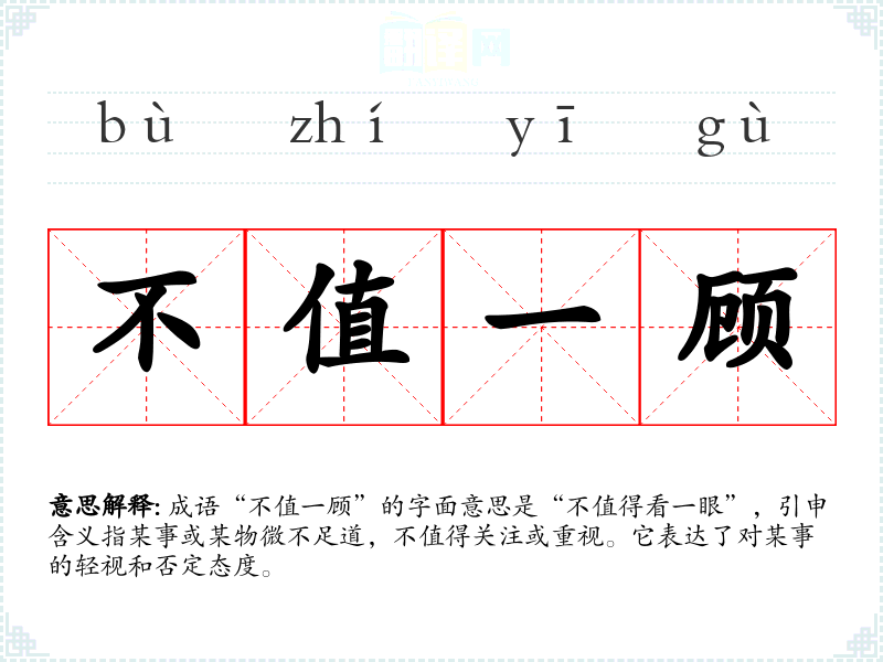 成语“不值一顾”的字面意思是“不值得看一眼”,引申含义指某事或某物微不足道,不值得关注或重视。它表达了对某事的轻视和否定态度。
