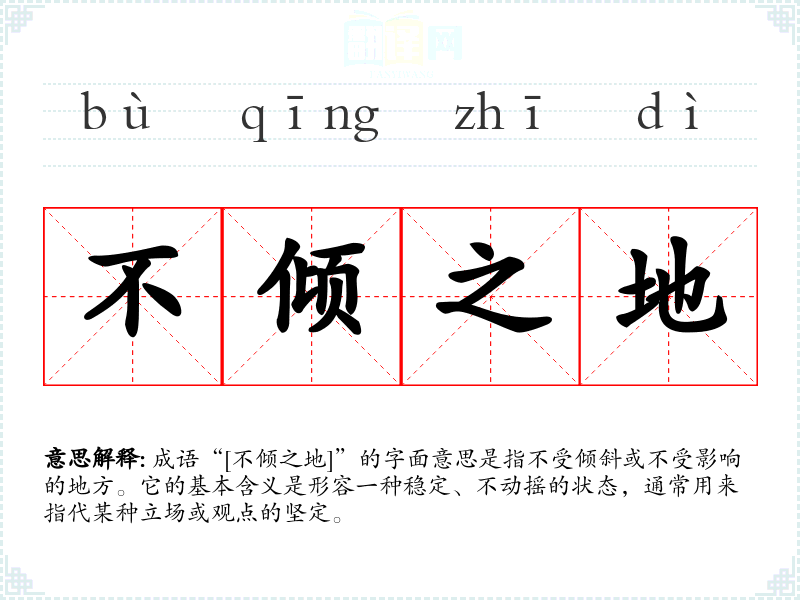 成语“[不倾之地]”的字面意思是指不受倾斜或不受影响的地方。它的基本含义是形容一种稳定、不动摇的状态,通常用来指代某种立场或观点的坚定。