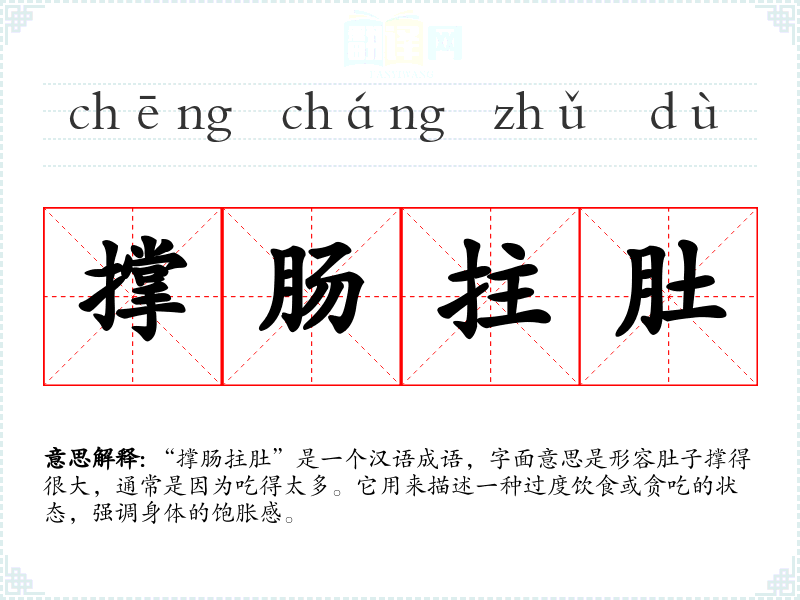 “撑肠拄肚”是一个汉语成语,字面意思是形容肚子撑得很大,通常是因为吃得太多。它用来描述一种过度饮食或贪吃的状态,强调身体的饱胀感。