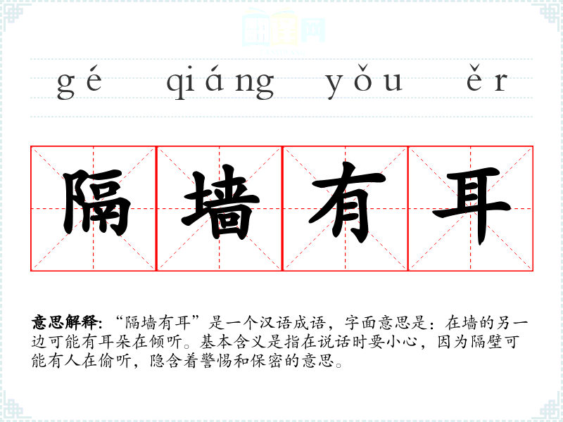 “隔墙有耳”是一个汉语成语,字面意思是:在墙的另一边可能有耳朵在倾听。基本含义是指在说话时要小心,因为隔壁可能有人在偷听,隐含着警惕和保密的意思。