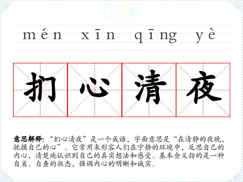 通过对“扪心清夜”的学,我深刻理解了内省的重要性。这不仅是对自我的一种探索,也是一种心理调适的方式。在语言学和表达中,能够运用这样的成语,帮助我更加深刻地表达内心感受及思考,提升了我的语言能力和情感表达。