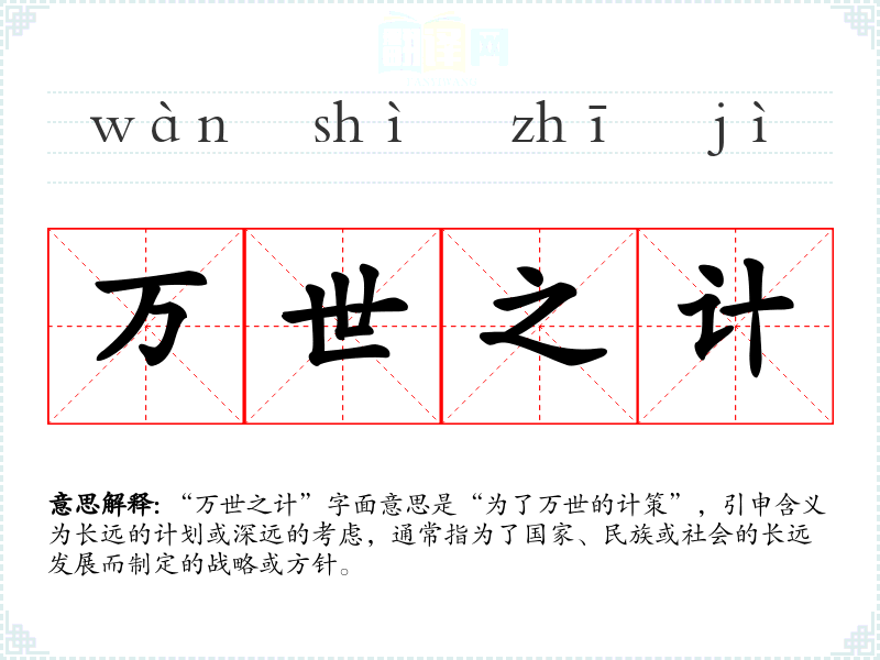 “万世之计”字面意思是“为了万世的计策”,引申含义为长远的计划或深远的考虑,通常指为了国家、民族或社会的长远发展而制定的战略或方针。