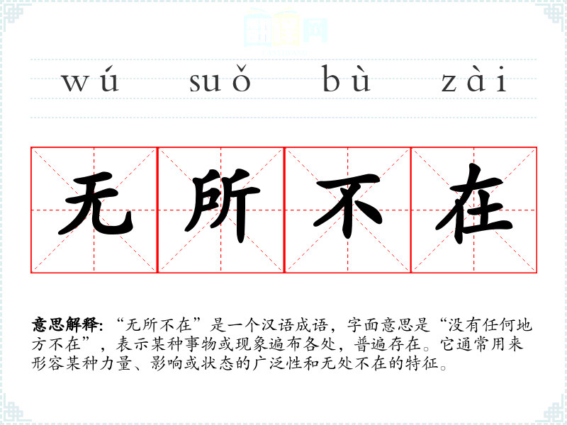 “无所不在”是一个汉语成语,字面意思是“没有任何地方不在”,表示某种事物或现象遍布各处,普遍存在。它通常用来形容某种力量、影响或状态的广泛性和无处不在的特征。
