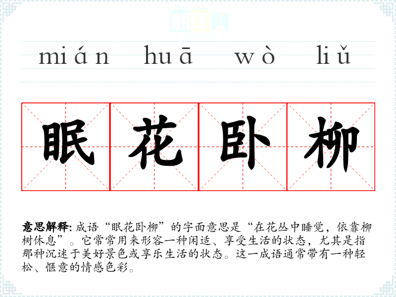 成语“眠花卧柳”的字面意思是“在花丛中睡觉,依靠柳树休息”。它常常用来形容一种闲适、享受生活的状态,尤其是指那种沉迷于美好景色或享乐生活的状态。这一成语通常带有一种轻松、惬意的情感色彩。