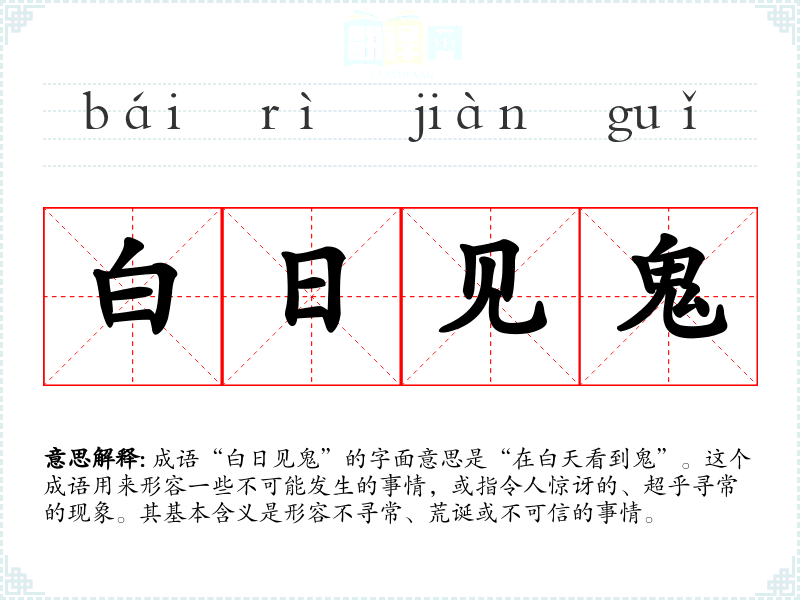 成语“白日见鬼”的字面意思是“在白天看到鬼”。这个成语用来形容一些不可能发生的事情,或指令人惊讶的、超乎寻常的现象。其基本含义是形容不寻常、荒诞或不可信的事情。