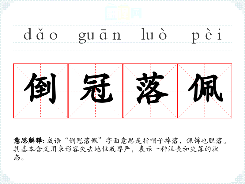 成语“倒冠落佩”字面意思是指帽子掉落,佩饰也脱落。其基本含义用来形容失去地位或尊严,表示一种沮丧和失落的状态。