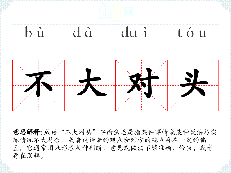 成语“不大对头”字面意思是指某件事情或某种说法与实际情况不太符合,或者说话者的观点和对方的观点存在一定的偏差。它通常用来形容某种判断、意见或做法不够准确、恰当,或者存在误解。