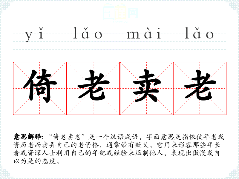“倚老卖老”是一个汉语成语,字面意思是指依仗年老或资历老而卖弄自己的老资格,通常带有贬义。它用来形容那些年**或资深人士利用自己的年纪或经验来压制他人,表现出傲慢或自以为是的态度。