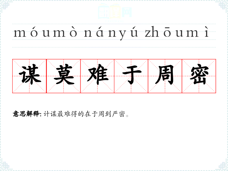 | 谋莫难于周密 | 计谋最难得的在于周到严密。 |