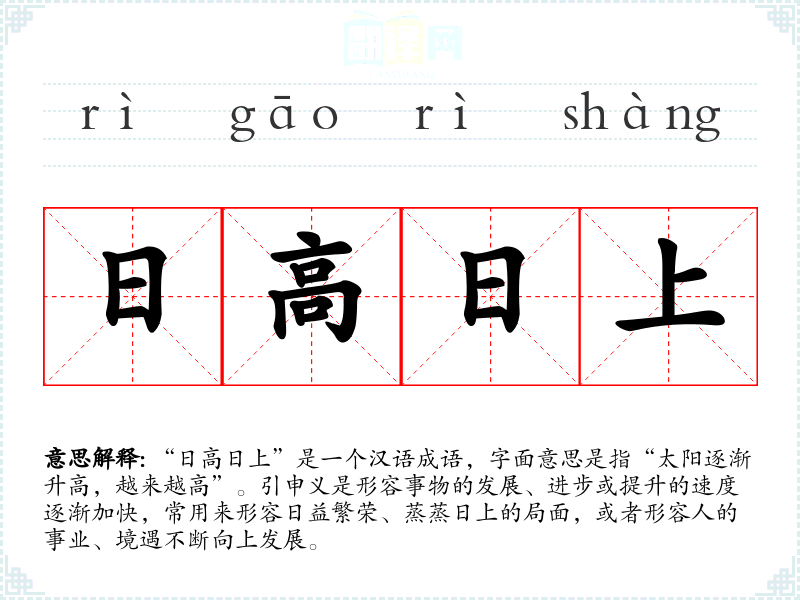 “日高日上”出自古代文献,虽然具体的出处不详,但可以看作是对自然现象的观察和哲理的总结。在古代,太阳的升起和高度被认为是时间的标志,象征着光明和希望,因此这个成语也蕴含着积极向上的含义。