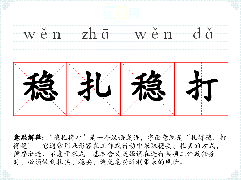 “稳扎稳打”是一个汉语成语,字面意思是“扎得稳,打得稳”。它通常用来形容在工作或行动中采取稳妥、扎实的方式,循序渐进,不急于求成。基本含义是强调在进行某项工作或任务时,必须做到扎实、稳妥,避免急功近利带来的风险。