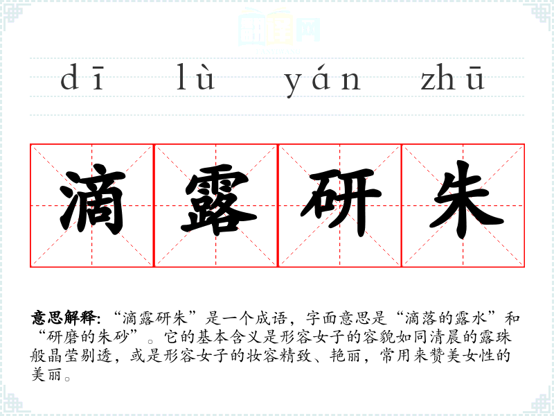 “滴露研朱”是一个成语,字面意思是“滴落的露水”和“研磨的朱砂”。它的基本含义是形容女子的容貌如同清晨的露珠般晶莹剔透,或是形容女子的妆容精致、艳丽,常用来赞美女性的美丽。