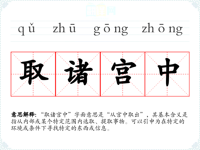 “取诸宫中”字面意思是“从宫中取出”,其基本含义是指从内部或某个特定范围内选取、提取事物。可以引申为在特定的环境或条件下寻找特定的东西或信息。