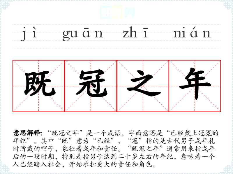 “既冠之年”源自**古代的成年礼制度。在古代,男子到达二十岁时会举行冠礼,象征着他们从少年转变为成年人,开始承担家庭和社会的责任。成语的使用可以追溯到《论语》等古典文献中,对青年的责任和成长有着深刻的探讨。
